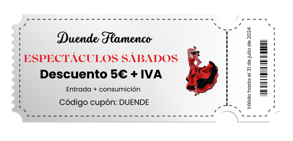 Durante el primer mes de apertura de «El Duende Flamenco», ofrecemos un descuento de 5€ + IVA en las entradas para nuestros espectáculos de flamenco los sábados.